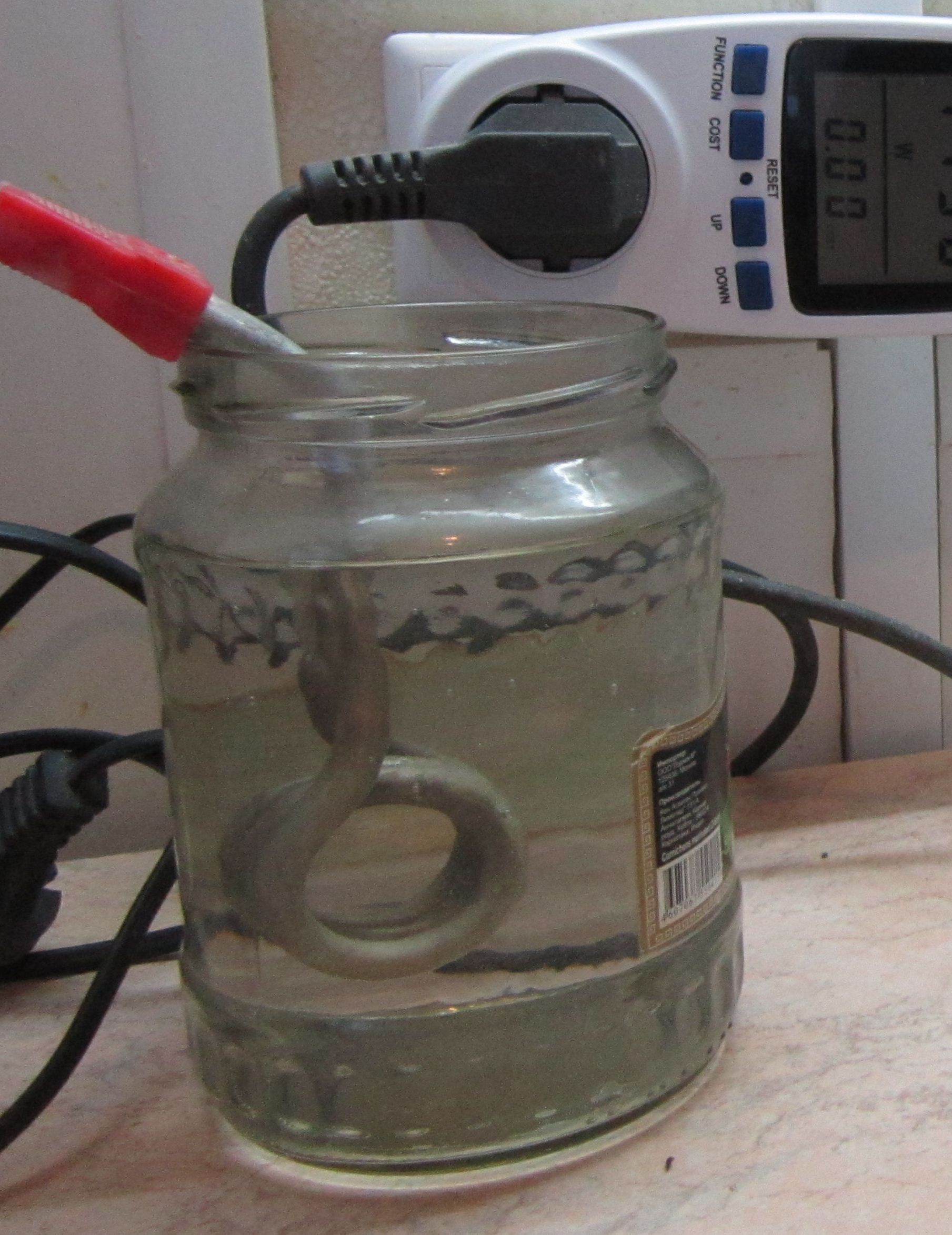 Существует мнение, что чем мощней нагревательный элемент, тем меньше электроэнергии будет потрачено на нагрев воды (пропорционально объёму). Испытаем? Взял, уже знакомый нам чайник, и маленький кипятильник.