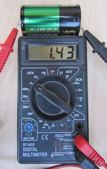 Переключатель функций в положение DCV, предел 20 Вольт. Напряжение 1,43 Вольта. Полярность напряжения - красный щуп плюс, черный минус.